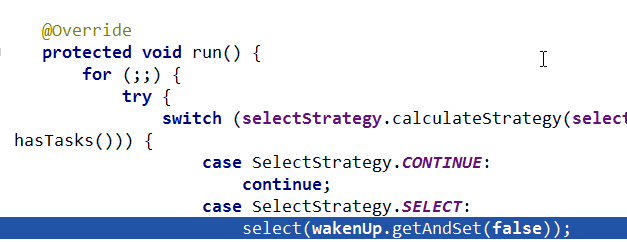 Debug程序到NioEventLoop类的run代码,无限循环,在服务器端运行。