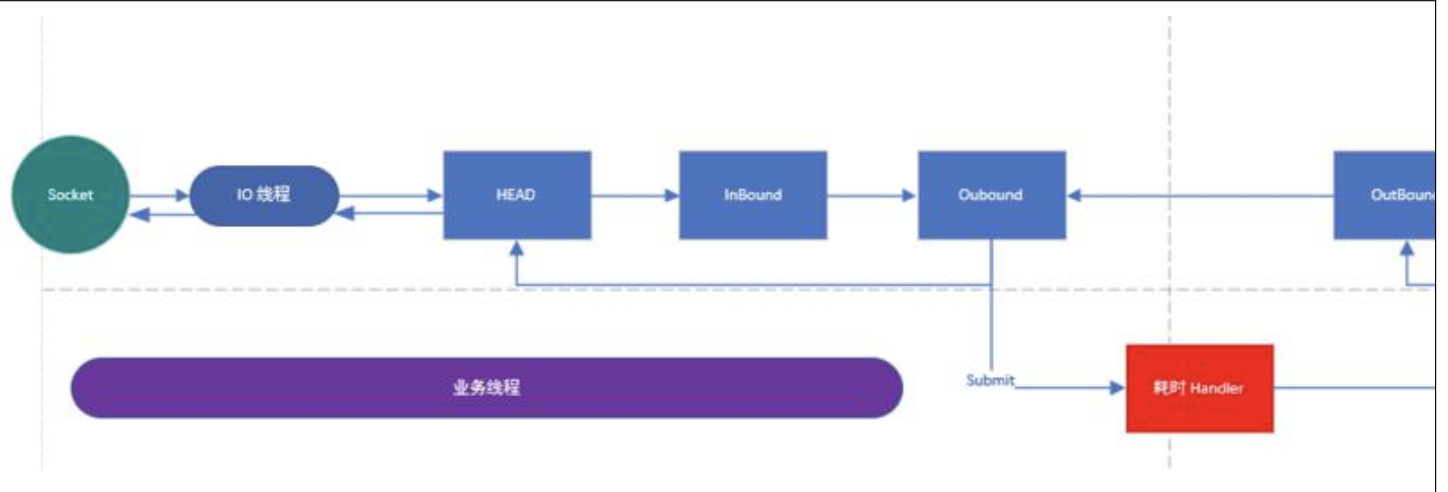 1)解释一下上图,当 IO 线程轮询到一个 socket 事件,然后,IO 线程开始处理,当走到耗时 handler 的时候,将耗时任务交给业务线程池。