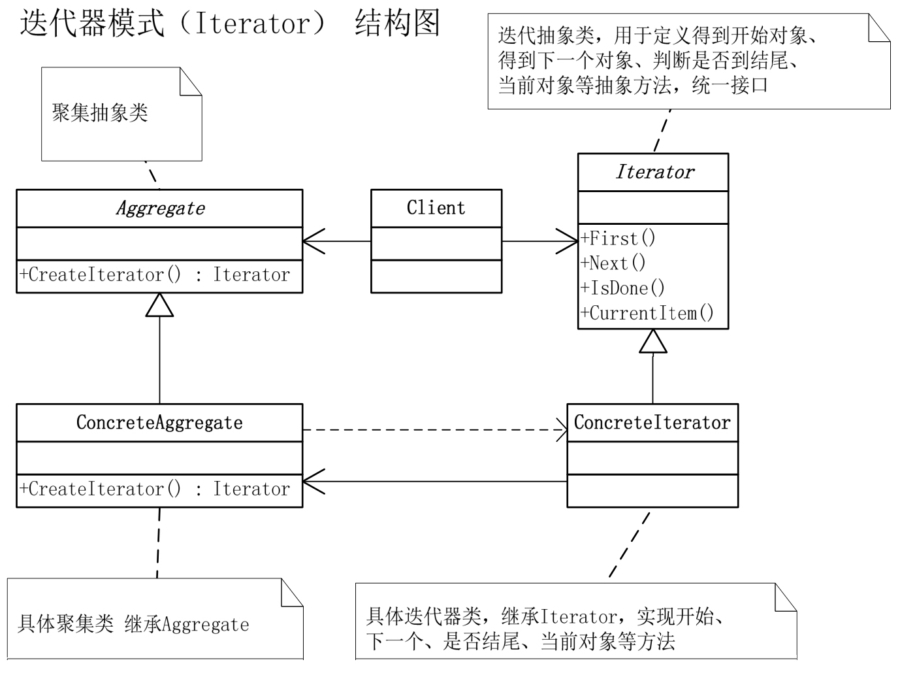 Iterator类,一般包括:first、next、isDone和currentItem几个抽象方法。 - 定义具体迭代器对象: