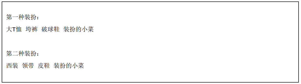 想要给人一个较好的印象,穿衣搭配得体干净是不可或缺的。我们可以使用程序写一个可以给人搭配不同服饰的系统,比如类似QQ、电商平台或游戏都有的Avatar系统,实现给人搭配嘻哈服或白领装的功能。程序预期的输出效果如下图所示。