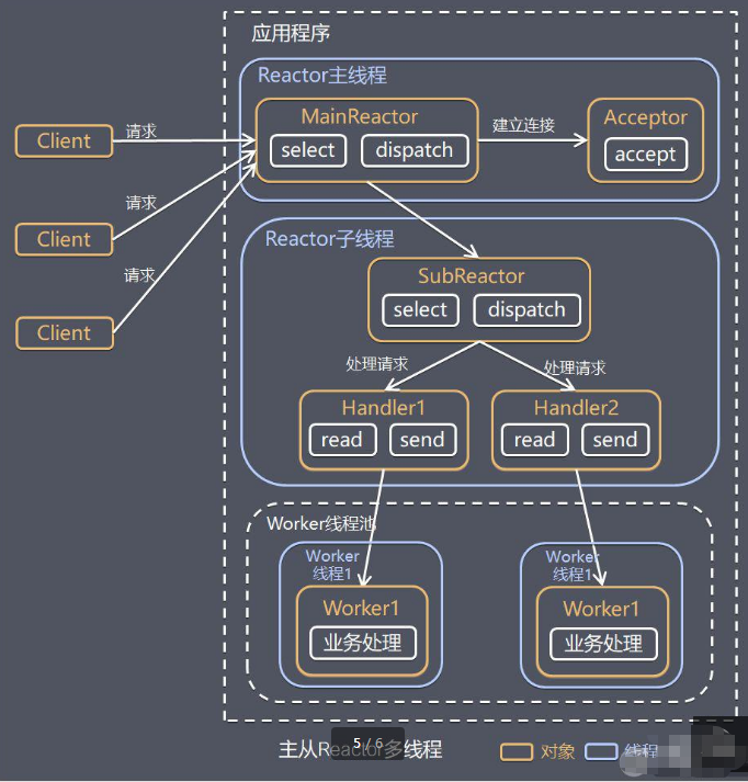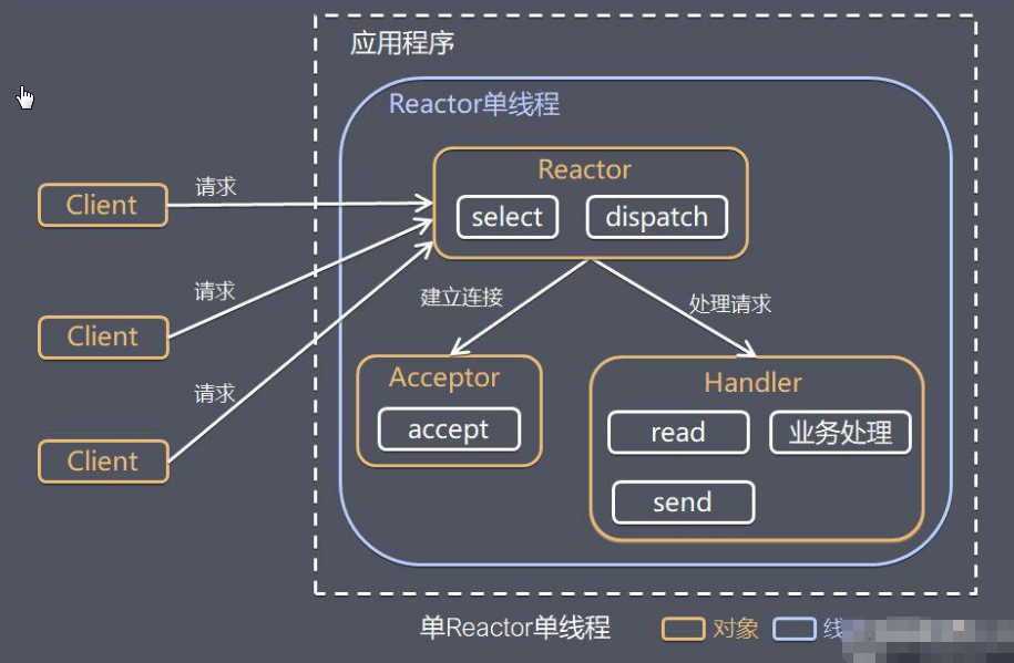 Reactor:Reactor在一个单独的线程中运行,负责监听和分发事件,分发给适当的处理程序来对IO事件做出反应。它就像公司的电话接线员,它接听来自客户的电话并将线路转移到适当的联系人;Handlers:处理程序执行I/O事件要完成的实际事件,类似于客户想要与之交谈的公司中的实际官员。Reactor通过调度适当的处理程序来响应I/O事件,处理程序执行非阻塞操作。