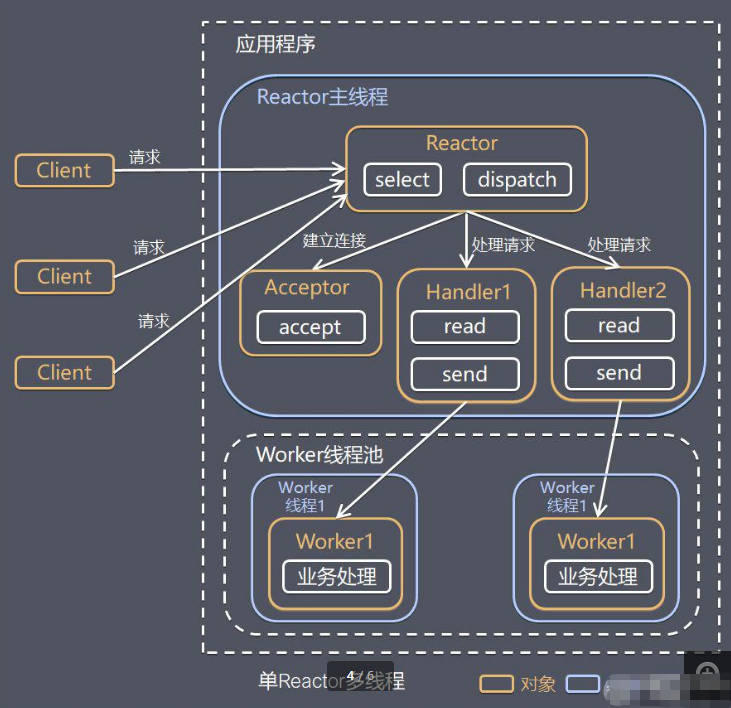 Reactor分发调用连接对应的handler来处理 handler只负责响应事件,不做具体的业务处理,通过read读取数据后,会分发给后面的worker线程池的某个线程处理业务worker线程池会分配独立线程完成真正的业务,并将结果返回给handlerhandler收到响应后,通过send将结果返回给client