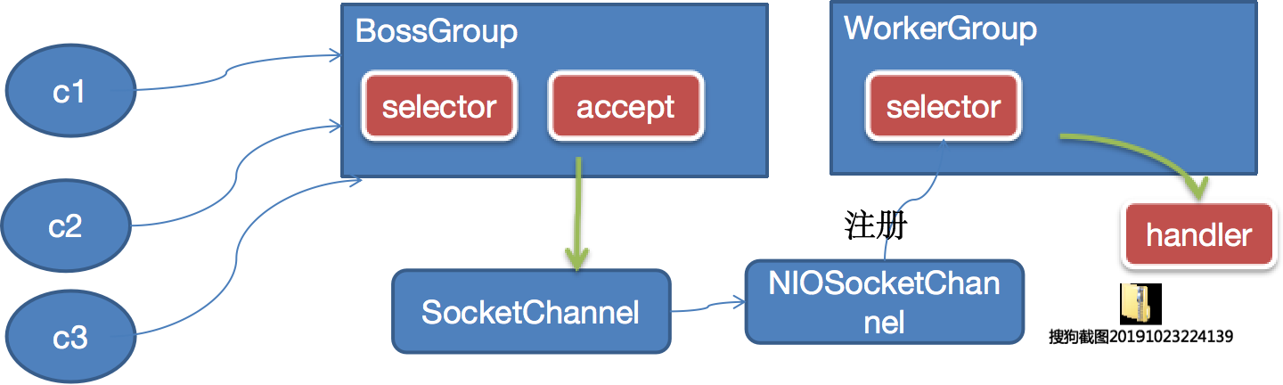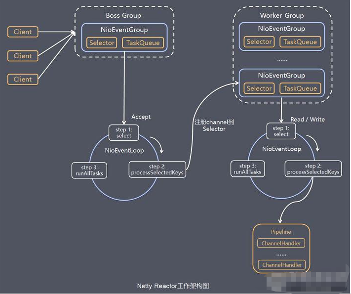 accept事件,与client建立连接,生成NioScocketChannel,并将其注册到某个workerNIOEventLoop上的Selector - 处理任务队列的任务,即