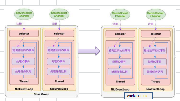 Netty抽象出两组线程池BossGroup专门负责接收客户端的连接,WorkerGroup专门负责网络的读写BossGroup和WorkerGroup类型都是NioEventLoopGroupNioEventLoopGroup相当于一个事件循环组,这个组中含有多个事件循环,每一个事件循环是NioEventLoopNioEventLoop表示一个不断循环的执行处理任务的线程,每个NioEventLoop都有一个Selector,用于监听绑定在其上的socket的网络通讯NioEventLoopGroup可以有多个线程,即可以含有多个NioEventLoop- 每个