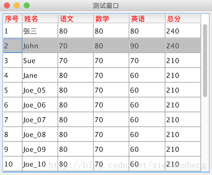 - 添加到JScrollPane滚动容器中,此添加方式不需要额外添加表头,jTable添加到jScrollPane中后,表头自动添加到滚动容器的顶部,并支持行内容的滚动(滚动行内容时,表头会始终在顶部显示)。
