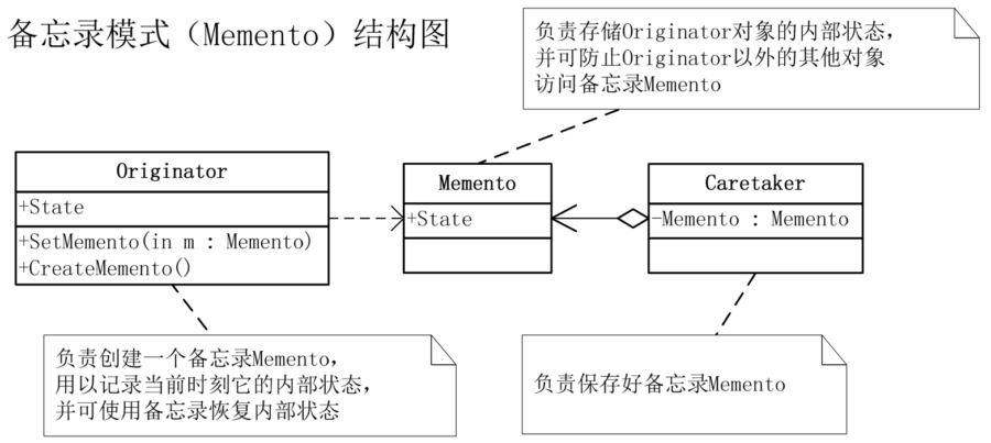 备忘录模式(Memento)是在不破坏封装性的前提下,捕获一个对象的内部状态,并在该对象之外保存这个状态,这样以后就可以将该对象恢复到原先保存的状态。