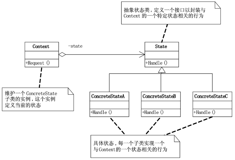 - State:抽象状态类,定义一个接口用来封装与 Context 的一个特定状态相关的行为。
