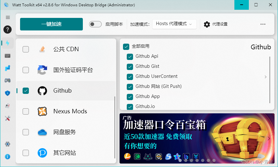 2)打开应用程序,在网络加速界面,勾选Github,然后点击一键加速