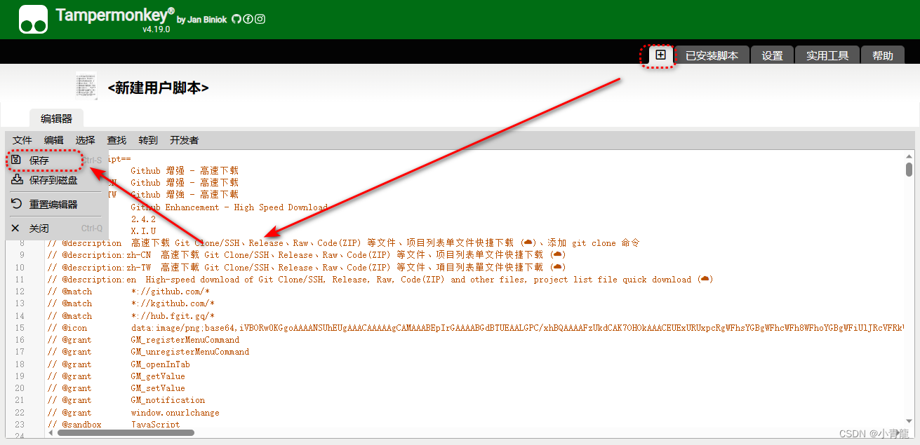 2. 如果此方法安装失败,可以手动复制源代码,然后粘贴到【Tampermonkey 管理面板】-【新建用户脚本】-【编辑器】中,然后在编辑器中选择【文件】-【保存】