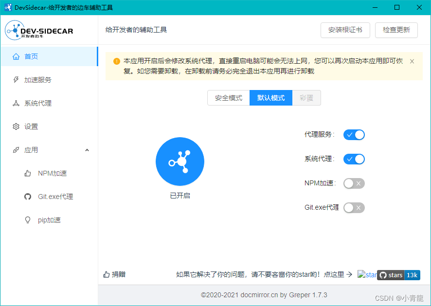 如果此时你的 Github 访问不了,你可以到 docmirror/dev-sidecar | Gitcode (opens new window) 下载,这是 dev-sidecar 的作者在 Gitcode 维护的项目,目前与 Github 里的保持同步,安装部署请参考 README.md (opens new window)