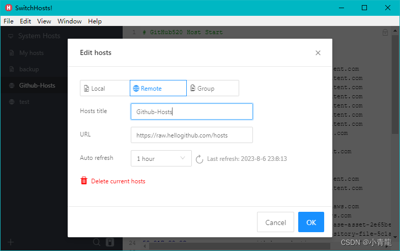 3)Hosts title 随便取,URL 填写 https://raw.hellogithub.com/hosts ,Auto refresh 选择1 hour,然后 OK 保存;